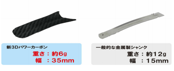 一般的に金属(約12g)を使用することが多いソール補強パーツにカーボンを採用。ラケット・ゴルフクラブで培ったカーボン技術を生かし、立体成型した「3Dパワーカーボン」が半分の重量で面積を広げることを可能にし、軽量性と安定性を両立します。