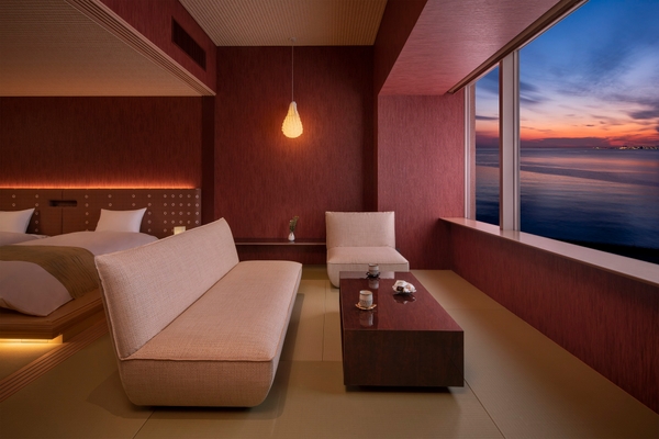 界 別府の客室は全室オーシャンビューです。目前に広がる海の景色を絵画のように楽しめる「ピクチャーウィンドウ」が特徴的です。室内を、寝室と居室に区切る間仕切りの建具を開け放つと、海とつながるかのような開放感を味わえます。また、壁紙や障子、浴室のガラスには、海の色を引き立てる柿渋色が用いられています。柿渋色は別府にある血の池地獄の赤から着想を得ており、日本一の源泉数及び湧出量を誇る別府温泉の熱気や、温泉が湧きだす溶岩台地の土っぽさを表現しています。