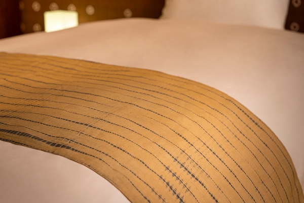 客室は全70室がご当地部屋です。ご当地部屋は「王道なのに、あたらしい。」をテーマに全国で展開する温泉旅館ブランド「界」が用意する、地域の文化を存分に体験できる客室です。界 別府では、豊後絞り(注1)をヘッドボードやフットスローなどのインテリアに用いています。