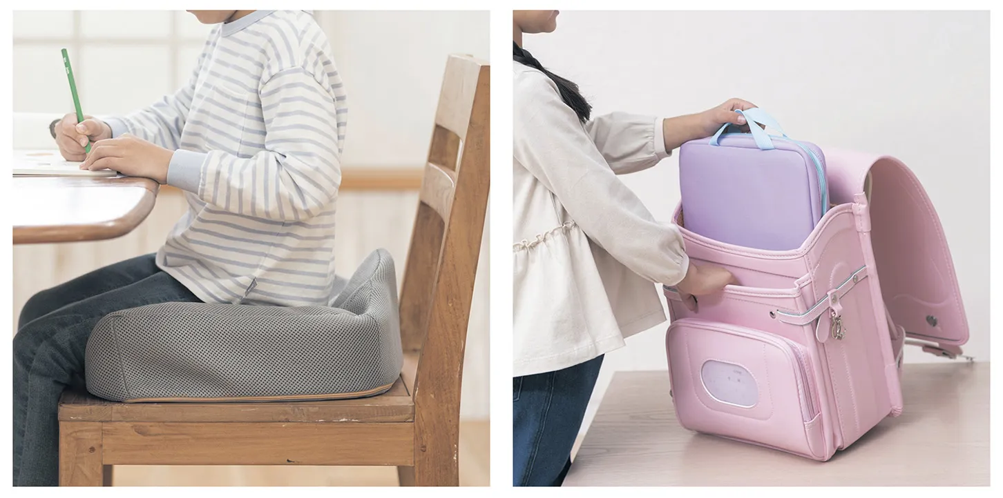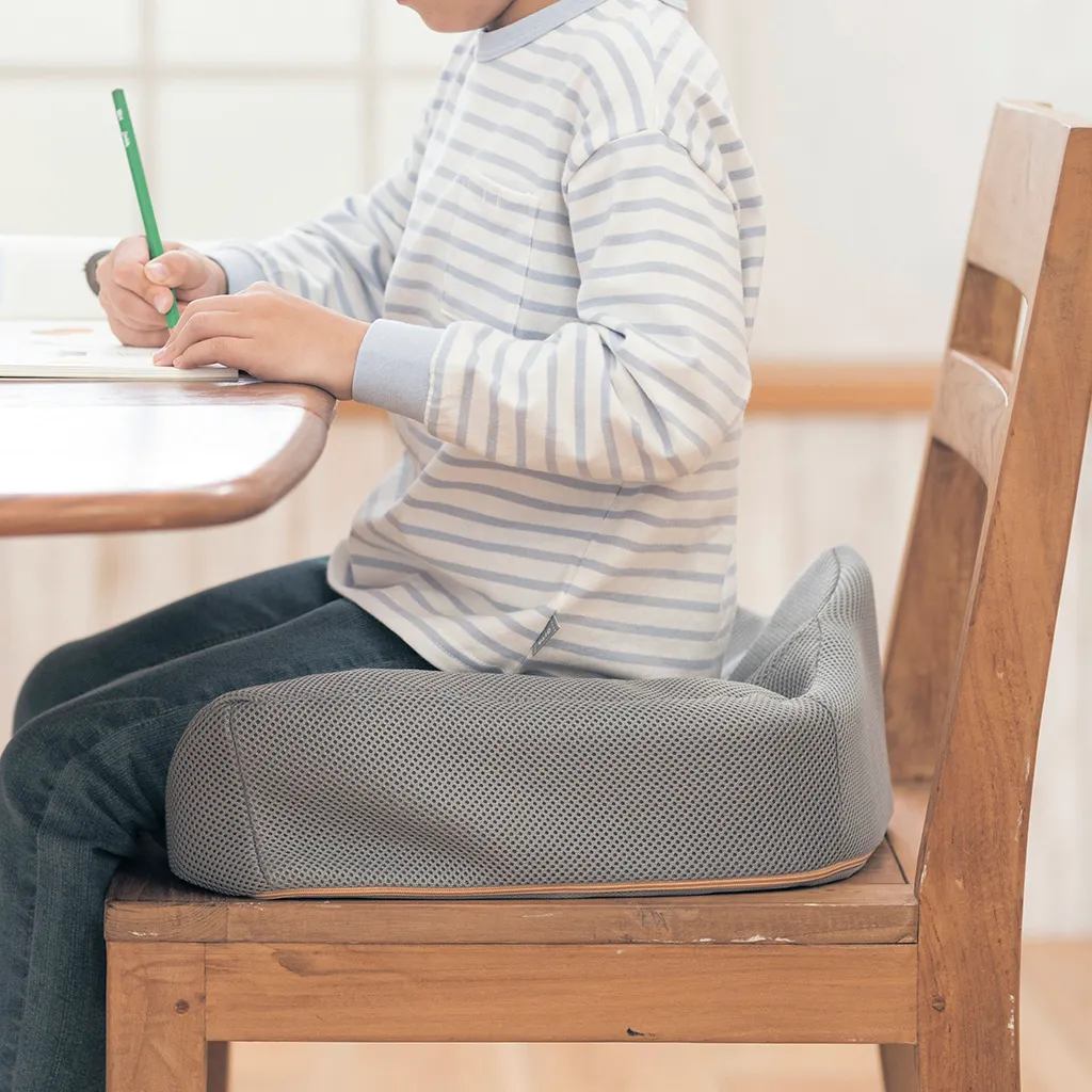 「大人も子供も使える姿勢サポートクッション」は、子どもがダイニングチェアに座ったときに机の高さが身長と合わず 、姿勢が悪くなり集中力の妨げになるとされている問題を防ぐアイテムです。お尻から太ももにかけてクッションがフィットすることで、脚の位置を安定させることができます。また、背中側にもクッションがあるため、骨盤から姿勢を正し、背もたれに頼らずラクに良い姿勢をキープすることで、集中力の維持をサポートします。