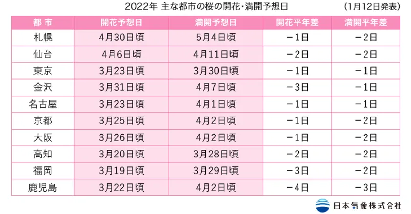 日本気象株式会社(本社:大阪市、代表取締役:鈴木 正徳、以下 日本気象)は、2022年1月12日に北海道から鹿児島までの約1,000か所のソメイヨシノについて、2022年第1回桜の開花・満開予想を発表しました。