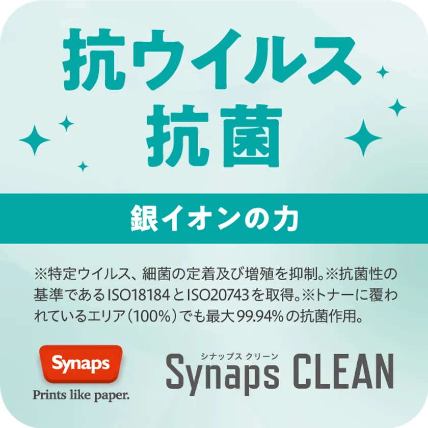 シナップス クリーンは抗菌・抗ウイルス加工したISO認証を取得している耐水紙です。レーザープリンターやコピー機等で手軽に印刷ができ、印刷後も抗菌・抗ウイルス機能を保ち、アルコール消毒をしても剥がれたりしません。