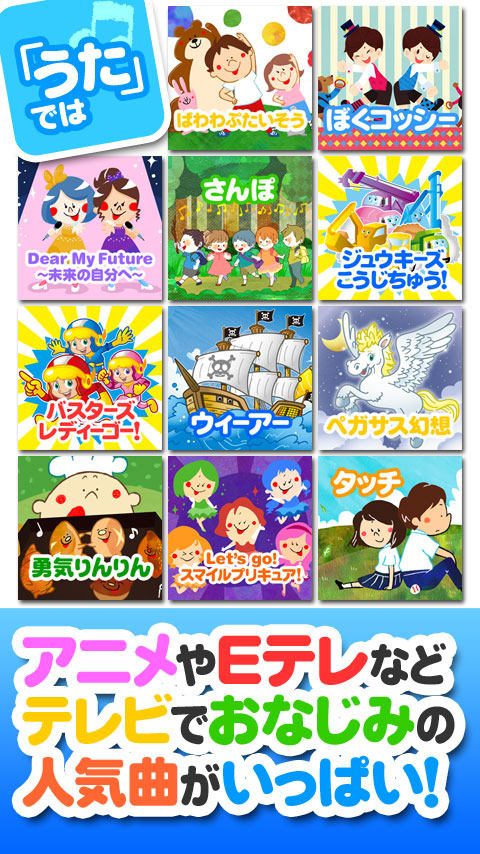 アニメ、特撮、Eテレソング、童謡などのジャンル検索をはじめ、人気順検索など、欲しい曲がすぐ見つかる検索機能をご用意しています。