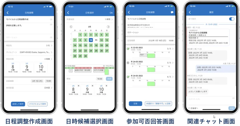 従来からも組織外ユーザー向け画面と共通の回答画面を準備していましたが本バージョンからMobileクライアント内で回答だけでなく日程調整の新規作成もできるようになりました。パソコン用のDesktopクライアントと同様にグラフィカルに空き時間を検索して日時候補を指定できます。回答画面も自分の予定をオーバーレイとして確認しながら回答が出来ます。もちろん日程調整に関するチャットもMobileクライアントで行えます。