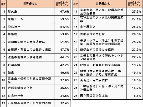 阪急交通社では日本にある世界遺産についての知名度調査を実施しました。全国500名以上の方を対象に、世界遺産として登録されている全25ヵ所を挙げ、「そこが世界遺産だと知っていたか」について回答してもらいました。