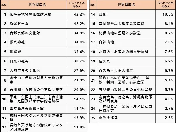それぞれの世界遺産に行ったことがあるかについても調査しました。結果はこちらです。