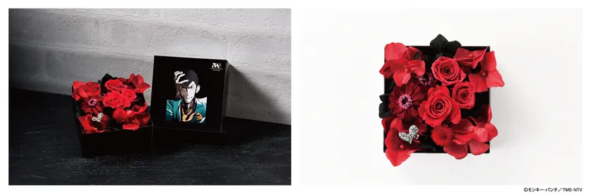 ルパン三世をイメージして制作したオリジナルプリザーブドフラワー。深紅のバラをメインに、ブラックのアジサイやワンポイントでスワロフスキーをあしらったゴージャスなデザインです。8,800円(税込)