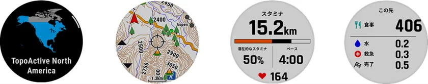 左から、海外大陸地図、GNSSマルチバンド、リアルタイムスタミナ、コースポイント表示