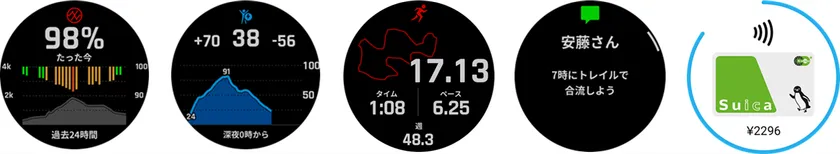 左から、血中酸素トラッキング、Body Battery、ランニング、通知機能、Suica