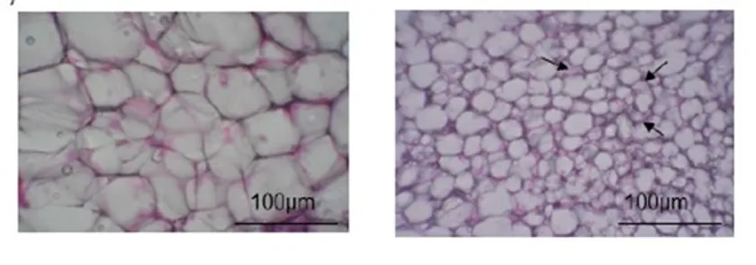 対照マウス(左)とカテキン重合物投与マウス(右)の鼠径部脂肪組織の病理組織学的観察結果