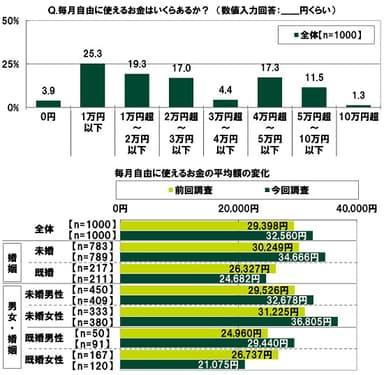 婚姻状況別にみると、未婚男性では3,152円の増加(前回調査29,526円→今回調査32,678円)、既婚男性では4,480円の増加(前回調査24,960円→今回調査29,440円)となりました。他方、未婚女性では5,580円の増加(前回調査31,225円→今回調査36,805円)となったのに対し、既婚女性では5,662円の減少(前回調査26,737円→今回調査21,075円)となっており、婚姻状況により対照的な結果となりました。