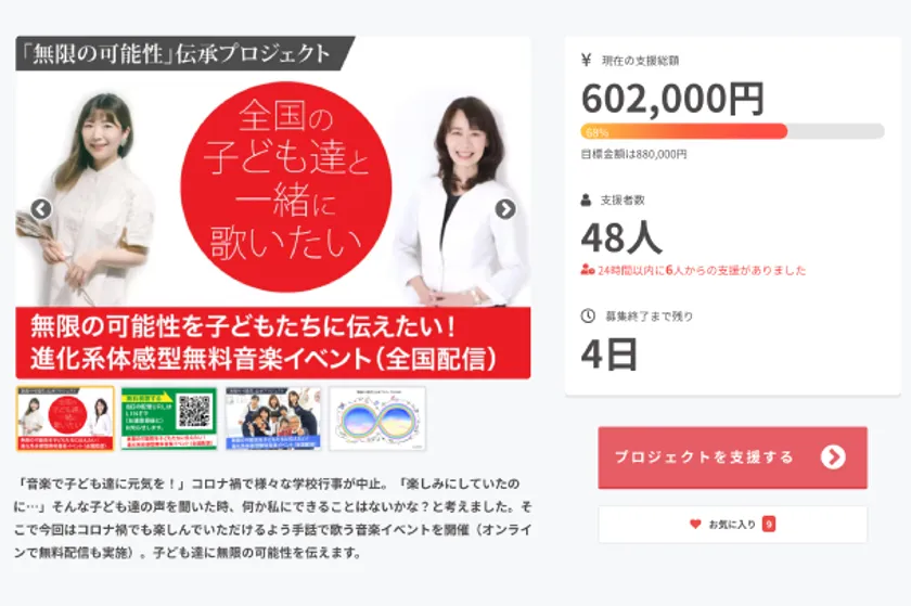 就業意欲がある女性たちをサポートし、生駒・奈良エリアを中心とした企業・行政と人材のマッチングで「女性・企業・地域」の三方よしの実現を目指す「株式会社BLOOM」(本社:奈良県生駒市、代表取締役:竹本 千秋)は、「無限の可能性を子どもたちに伝えたい!進化系体感型無料音楽イベント(全国配信)」を1月23日(日)に開催いたします。また、本イベントの開催支援プロジェクトを、クラウドファンディングサイト「CAMPFIRE(キャンプファイヤー)」にて2022年1月16日(日)まで実施しています。※本支援プロジェクトは、All-in方式で実施しています。目標金額に満たない場合であっても、イベントは必ず開催いたします。