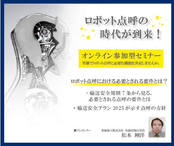 点呼機器およびアルコール検知器を開発・販売する東海電子株式会社(本社:静岡県富士市 代表取締役:杉本 哲也)は、 この度、 「AIが企業を動かす!皆様でロボット点呼に必要な機能を決定しませんかセミナー」(無料)を7月15日(木)と7月27日(火)に開催いたします。