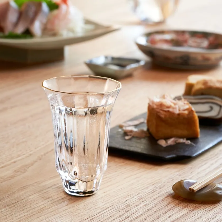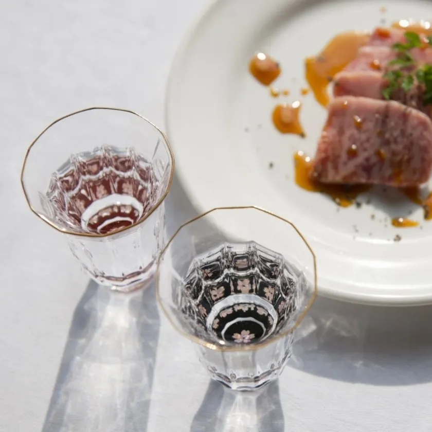 このガラスに螺鈿細工を施す技は当社でしか表現できない繊細な技術になり、水や日本酒を注ぐことで、グラスの各側面に螺鈿が反射しまるで万華鏡のような神秘的な輝きを放ちます。