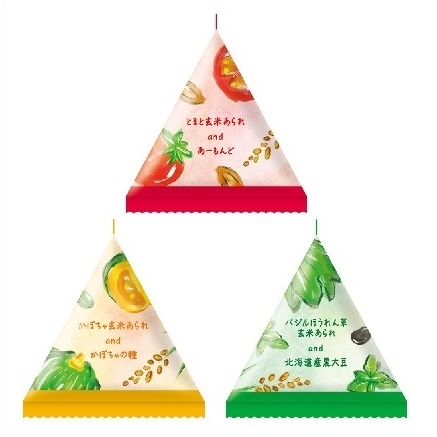 とまと、かぼちゃ、バジルほうれん草の3種の野菜玄米あられ+素焼きナッツ&シードをアソート。食べ飽きない味わいと彩りにこだわったお米のお菓子です。