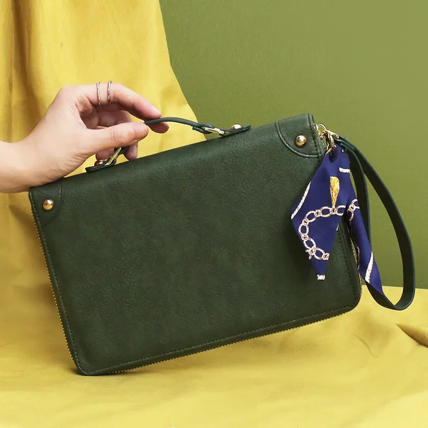 ベージュ、グリーンの2種。手帳、ペンケース、スマートフォン、ハンカチなど様々なものが入る、マルチに使える多機能ケースです。