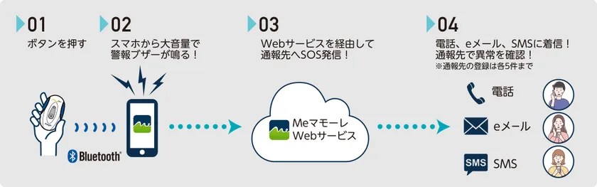 Meマモーレとは、シリーズ端末とBluetooth対応のスマートフォン、そしてクラウドサービスが連携をして、緊急通報を行うシステムの名称です。