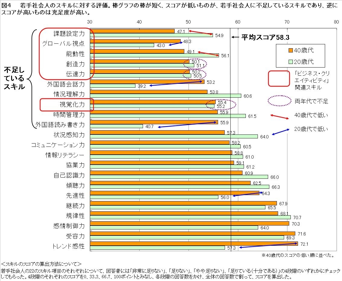 不足しているスキルとして40歳代管理職と20歳代一般社員に共通するのは「創造力」、「伝達力」、「視覚化力」である。全体の平均スコアが58.3ポイントであるのに対して、これらの3項目はいずれもスコアが50~56ポイントにとどまる。