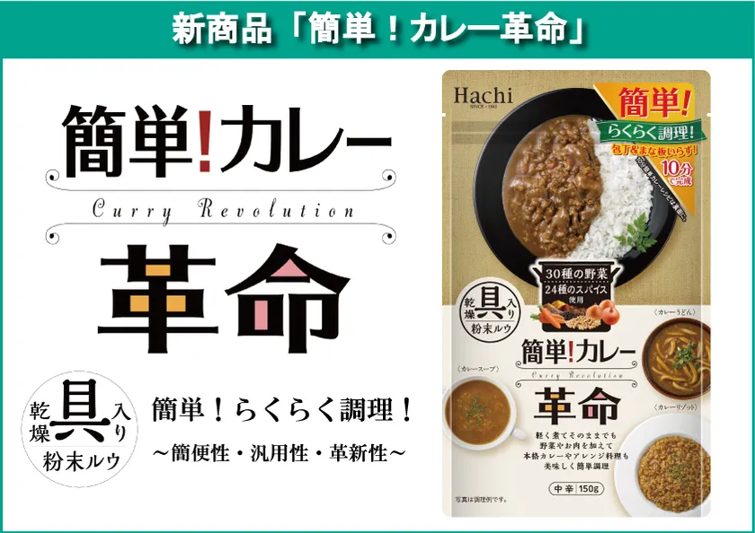 ハチ食品株式会社(大阪府大阪市、代表取締役社長:高橋 慎一)は、短時間で煮込んだカレーの味わいが楽しめる具材入りのカレールウ「簡単!カレー革命」を2022年3月1日(火)に発売いたします。