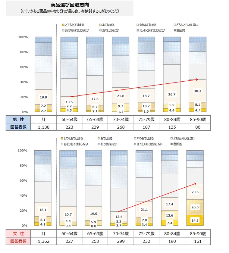 高齢者は高齢になるほど「コスパ検討志向」が低下。男女ともに60代前半では7割台があてはまると回答したが、高齢になるにつれて減少し、80代後半では、男性は4割半、女性は3割強まで低下する。他方で、「商品選び回避志向」は高齢になるほど増加。特に女性の70代前半から80代後半にかけての傾向が顕著で、70代前半では2割を下回っているが、80代後半では5割半の結果となった。