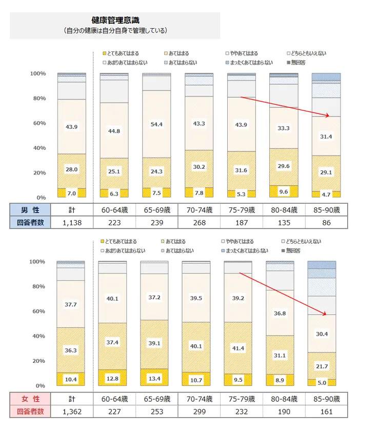 健康意識・食事意識をみると、「健康管理意識」が80代から顕著に低下。男性は、60代後半で最も高くなり70代も8割台で推移するものの、80代前半で72.6%、80代後半で65.1%と、意識が低下する。女性は、70代後半まで9割程度と高く推移するものの、男性同様80代前半で76.8%、80代後半で6割を下回る。
