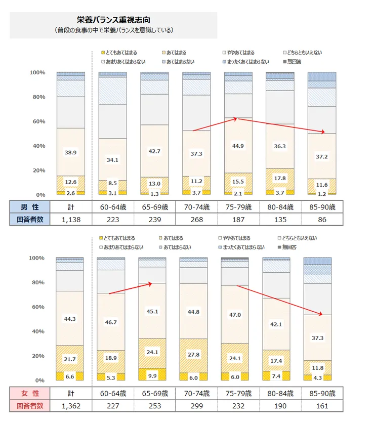 健康管理意識は80代で低下。同様に、栄養バランス重視する志向も80代から低下
