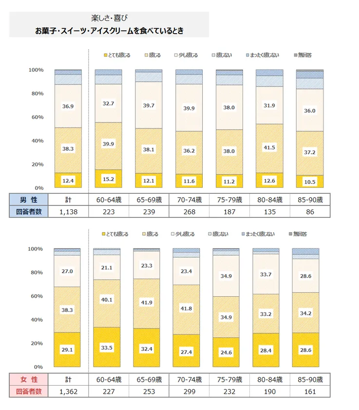 高齢男女の9割前後が「お菓子・スイーツ・アイスクリームを食べているとき」に楽しさ・喜びを感じる