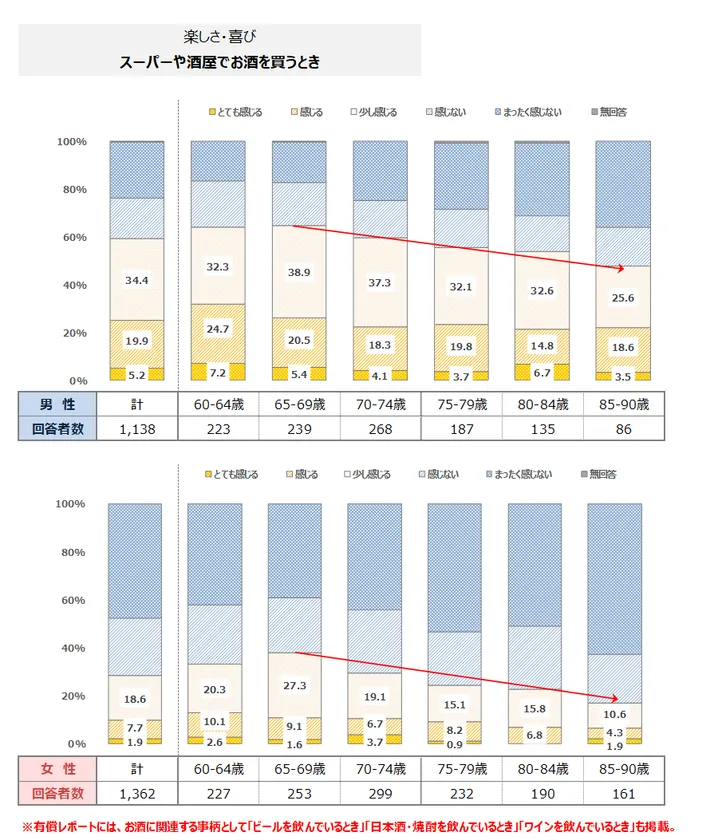 「スーパーや酒屋でお酒を買うとき」に感じる楽しさ・喜びは、高齢になるにつれて減少