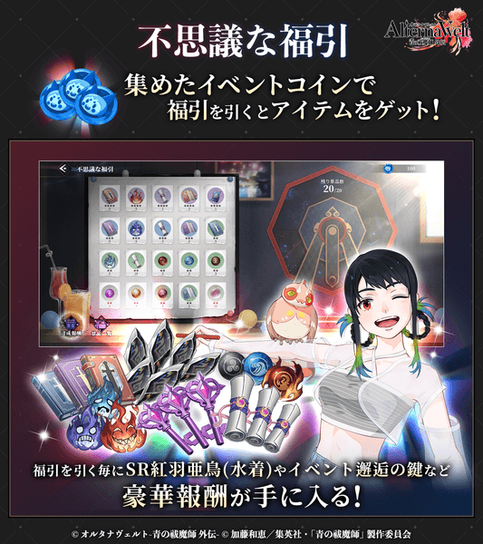 イベントを進めると、「SR 紅羽亜鳥(水着)」や、最大で魔輝石(無償)9200個、イベント邂逅の鍵×20個など、各種ゲーム内アイテムを獲得することができます。