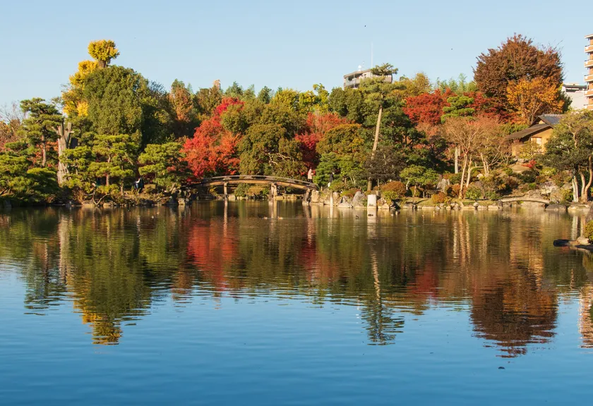 東本願寺の飛地境内地(とびちけいだいち)の庭園。1641(寛永18)年に三代将軍・徳川家光から当地(約1万坪)が寄進され、石川丈山の趣向を入れた作庭がなされました。庭園には四季折々の花が咲きほこり、変化に富んだ景観は「十三景」と称されています。1936(昭和11)年には、文人趣味にあふれる仏寺庭園として、国の名勝に指定されています。