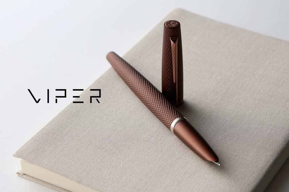 VIPER(バイパー)は、ギロシェパターンの彫刻だけでなく、アノダイズ加工のメタリックな風合いの仕上げとも好相性となっており、流線型のフォルムはボディ、グリップ、そして精緻に設計され滑らかな書き味を発揮するフーデッドニブへと一体感のある曲線を描きます。従来使用していた14金ペン先(エクセレンスA2、アエロなど)をステンレスにすることで価格を抑え、初めての万年筆としても最適なアイテム。機械で代えることの出来ない熟練による手作業で作り上げられたVIPERは、ブラウンの登場により、ブラウン/ブルー/ブラックの3色から自分のスタイルに合わせて選択できるようになります。