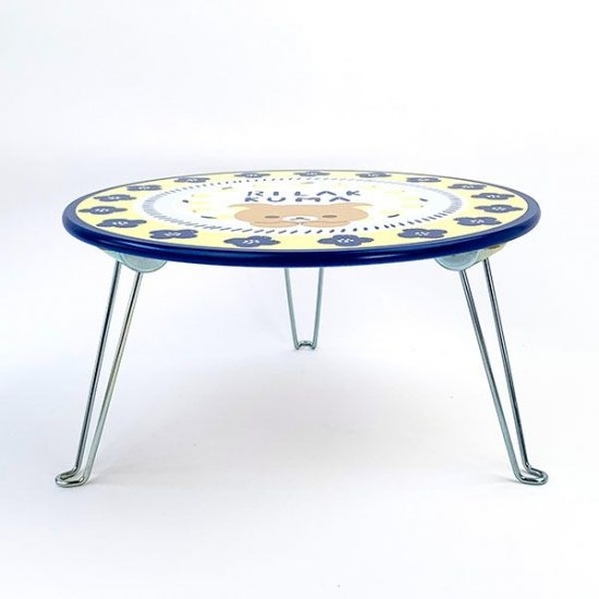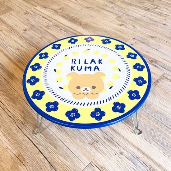 丸いテーブル盤の中央に、キュートなリラックマのイラスト。周りにはネイビーのお花がデザインされていて、ガーリーな仕上がりのテーブルです。