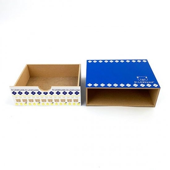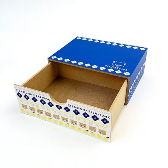 青い枠にもリラックマのワンポイントとお花がデザインされています。横型で7cm×20cm×15cmサイズのボックスは、お子さんのおもちゃボックスや小物入れにもピッタリ。ほかにも、衣類を整理したり本やDVDなどを収納したりと用途も幅広いんです。