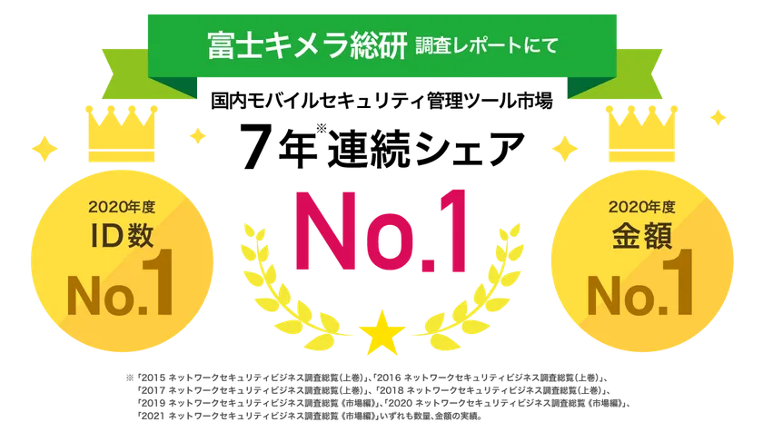 これにより、同社による過去発表の調査レポートを含め国内モバイルセキュリティ管理ツール市場で同項目のシェアが7年連続(2014~2020年度)でNo.1となりました※5。