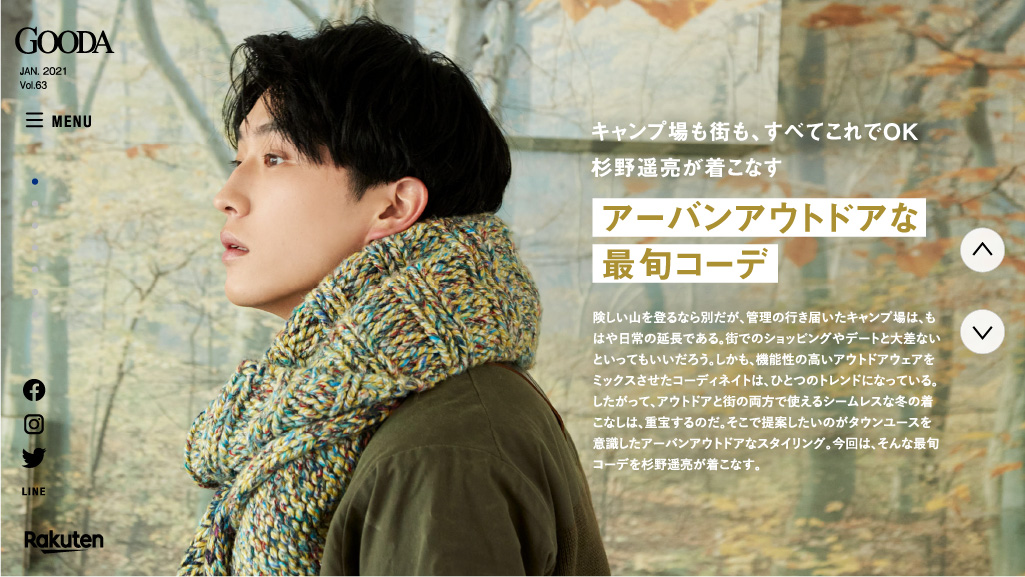 手にするだけで毎日ちょっとハッピーな気持ちになれる。そんな、とっておきを紹介しているライフスタイルWEBマガジン「GOODA」。冬キャンプを特集した今号の表紙には、話題作への出演が続き、競争の激しい若手俳優陣のなかでも、ひと際存在感を示している俳優・杉野遥亮さんが登場。ひとつのトレンドになっている機能性の高いアウトドアウェアをミックスさせたコーディネイトで、タウンユースを意識したアーバンアウトドアなスタイリングを披露。