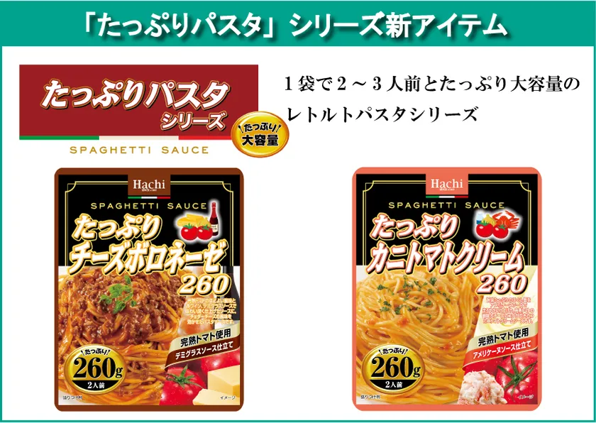 ハチ食品株式会社(大阪府大阪市、代表取締役社長:高橋 慎一)は、当社が展開するたっぷり大容量のレトルトパスタソースシリーズ『たっぷりパスタ』の新商品として、「たっぷりチーズボロネーゼ260」と「たっぷりカニトマトクリーム260」を2022年3月1日(火)に発売いたします。