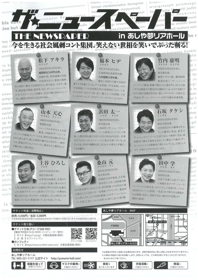 THE NEWSPAPER『ザ・ニュースペーパー』が2022年2月12日(土)にあしや夢リアホール(福岡県遠賀郡)にて開催されます。チケットはカンフェティ(運営:ロングランプランニング株式会社、東京都新宿区、代表取締役:榑松 ⼤剛)にて発売中です。