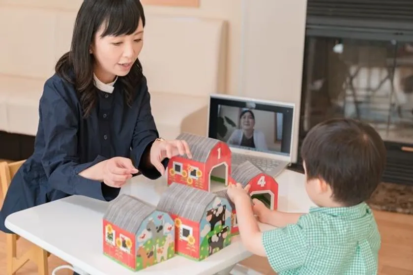 ご自宅と教室をオンライン会議システムZoomでつなぎ、心理士の資格を持つ職員がマンツーマンで発達支援を行います。お子様の成長を促す関わり方を習得していただくため、ご家庭での様子を見せていただき、イヤホンマイクを通してお子様への適切な声掛けや対応を伝えます。また、お子様の発達に合わせた目標と、保護者様の関わり方などについてフィードバックし、次回までの簡単なホームワークを出して、効果的な関わり方を習得できるように保護者様へのコーチングを行います。