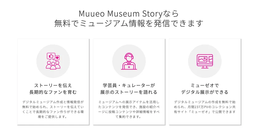ミューゼオ株式会社(本社:東京都品川区、代表取締役社長:成松 淳、以下 当社)は、博物館・美術館の展覧会情報などをウェブ上で公開・蓄積できるクラウドサービス「Muuseo Museum Story(ミューゼオ ミュージアムストーリー)」の無償提供を2022年1月18日に開始しました。