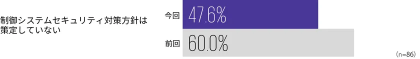 日本の製造業におけるスマートファクトリー化への取組みが加速するなか、工場のスマート化とともにサイバー攻撃のリスクは増大しています。回答企業の約3割が、何らかの形で工場やプラントにおける制御システムに関する事業に取り組んでいるなかで、まだ47.6%が制御システムセキュリティに係る対策方針が整備できていない状況です。前回調査(2019年)の60.0%と比べると改善傾向にありますが、さらなる取組み強化が求められます。