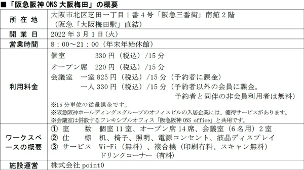 なお、『阪急阪神ONS大阪梅田』においては、大阪梅田という立地の利便性を活かして、移動中のスキマ時間を使った短時間作業等でのご利用を想定したオープン席も新設しました。個室よりも安価な料金設定としていますので、気軽にご利用いただけます。