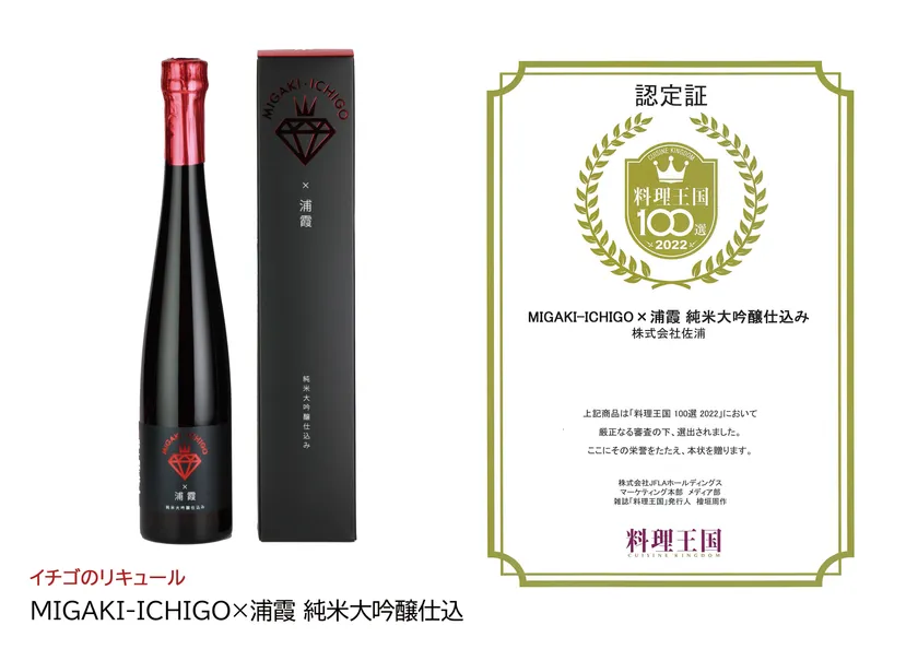 浦霞醸造元 株式会社佐浦(所在地:宮城県塩竈市、代表取締役社長:佐浦 弘一)は、“食べる宝石”ミガキイチゴを生産販売している株式会社GRAとのコラボレーションにより、イチゴのリキュール「MIGAKI-ICHIGO×浦霞 純米大吟醸仕込み」を販売しており、この度、本商品が「料理王国100選 2022」に入賞いたしました。