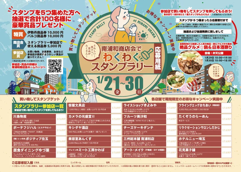 1月21日(金)~1月30日(日)まで開催される南浦和商店会主催のスタンプラリーです。スタンプラリー参加19店舗中、5店舗でお買物をしてスタンプを集めご応募いただくと、抽選で合計100名様に豪華賞品が当たります!!(1会計でスタンプ1個。お会計はいくらでも可)