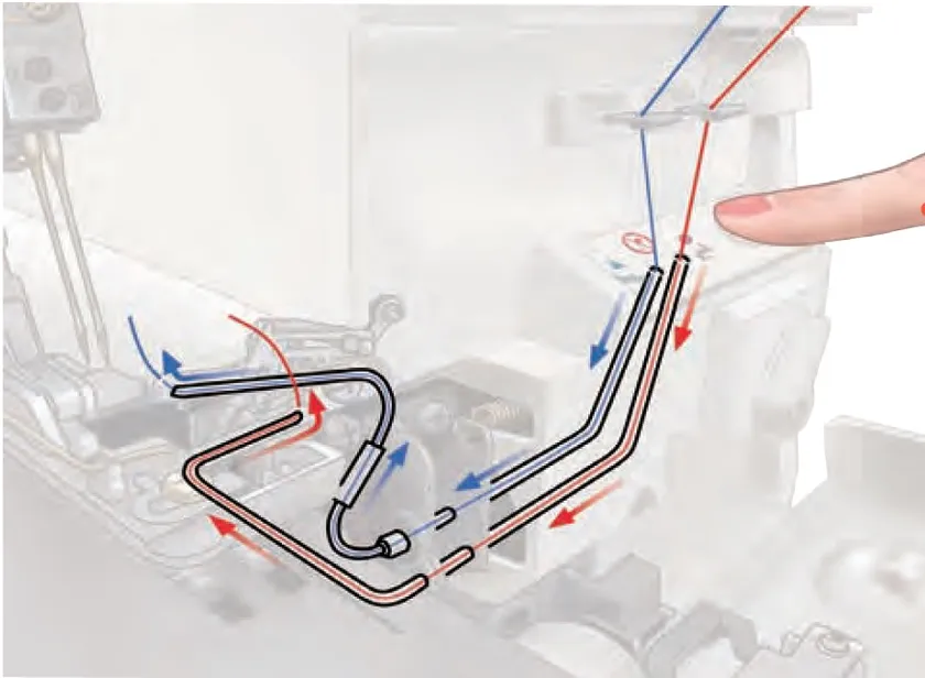 縫製前準備の糸掛けは、従来機「シュルル」のルーパー糸通し「イージースレッダー*」を踏襲し、ワンタッチで糸通しができる上、糸の種類への対応性を向上させ、ロックミシン特有の複雑で難しい糸通しを簡単にしました。