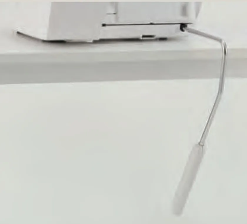 縫いやすさ・ソーイング環境の向上は、縫い始め時やカーブ縫いに有効な「押えの膝上げ機能」を採用しました。家庭用ミシン・職業用ミシンではおなじみの機能ですが、膝での操作により、押えの上下がスムーズになり、手元は縫いに集中できます。さらに、小回り押えを標準装備し、カーブ縫いの改善を図りました。また、巻き縫い時の糸調子も専用レバーの新設により、ダイヤル操作なしで簡単に設定ができるようになりました。