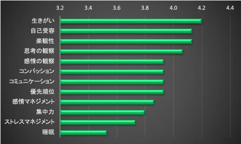 思考の観察と感情の観察は、上位3項目を高める上で欠かせない心のスキルであり、集中瞑想や観察瞑想、ボディスキャンなどのマインドフルネスの実践の結果と考えられます。