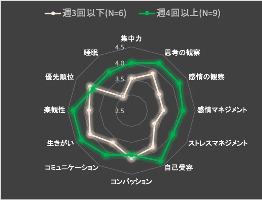参加者の中には、週1回のペースで参加する人もいれば、週5回参加する人もいます。参加頻度に応じた変化に対する影響を見てると、参加頻度が高いほど変化の度合いも大きいことが分かります。12項目中10項目において、週4回以上参加している人は、そうでない人に比べてより大きく変化を感じている結果となりました。両者の差が大きいのは、睡眠(Δ=0.89)、感情マネジメント(Δ=0.72)、ストレスマネジメント(Δ=0.67)、の項目となっています。