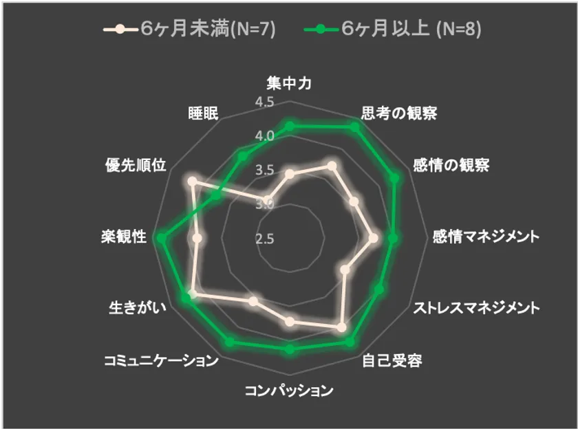 参加者の中には、1年以上参加している人もいれば、1ヶ月未満の人もいます。期間に応じた変化に対する影響を見てると、参加期間が長いほど変化の度合いも大きいことが分かります。12項目中10項目において、7ヶ月以上参加している人は、そうでない人に比べてより大きく変化を感じている結果となりました。両者の差が大きいのは、睡眠(Δ=0.73)、集中力(Δ=0.70)、感情マネジメント(Δ=0.68)、コミュニケーション(Δ=0.68)の項目となっています。