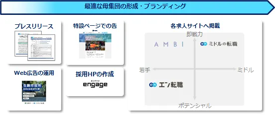 プレスリリースや特設ページ、採用HPの作成、Web広告を用いた告知に加え、各求人サイトでの集客サポートを実施いたします。『エン転職』『AMBI』『ミドルの転職』とターゲットの異なる3つの求人サイトを活用することで、ターゲットへ網羅的に求人を届けることが可能。また、採用ターゲットの策定から選考のアドバイスまで、全面的にサポートいたしました。