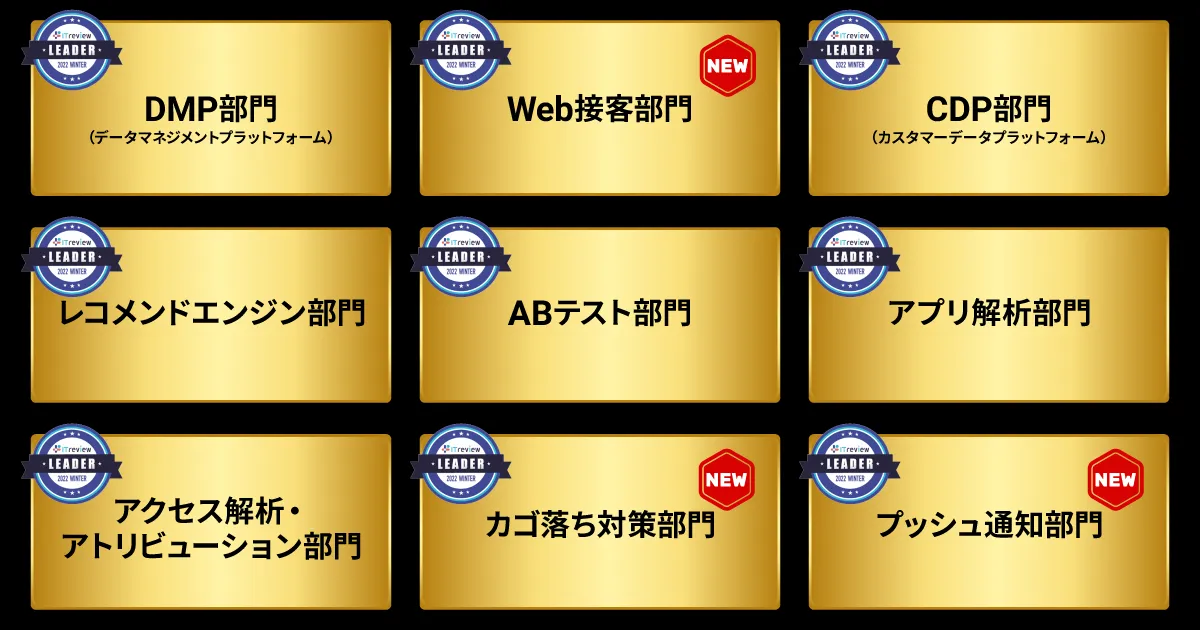 「Rtoaster」は、これまでのGrid Awardで受賞した「DMP(データマネジメントプラットフォーム)部門」、「CDP(カスタマーデータプラットフォーム)部門」、「レコメンドエンジン部門」、「ABテスト部門」、「アプリ解析部門」、「アクセス解析・アトリビューション部門」の6部門に加え、新たに「Web接客部門」、「カゴ落ち対策部門」、「プッシュ通知部門」の3部門においても「Leader」を受賞いたしました。